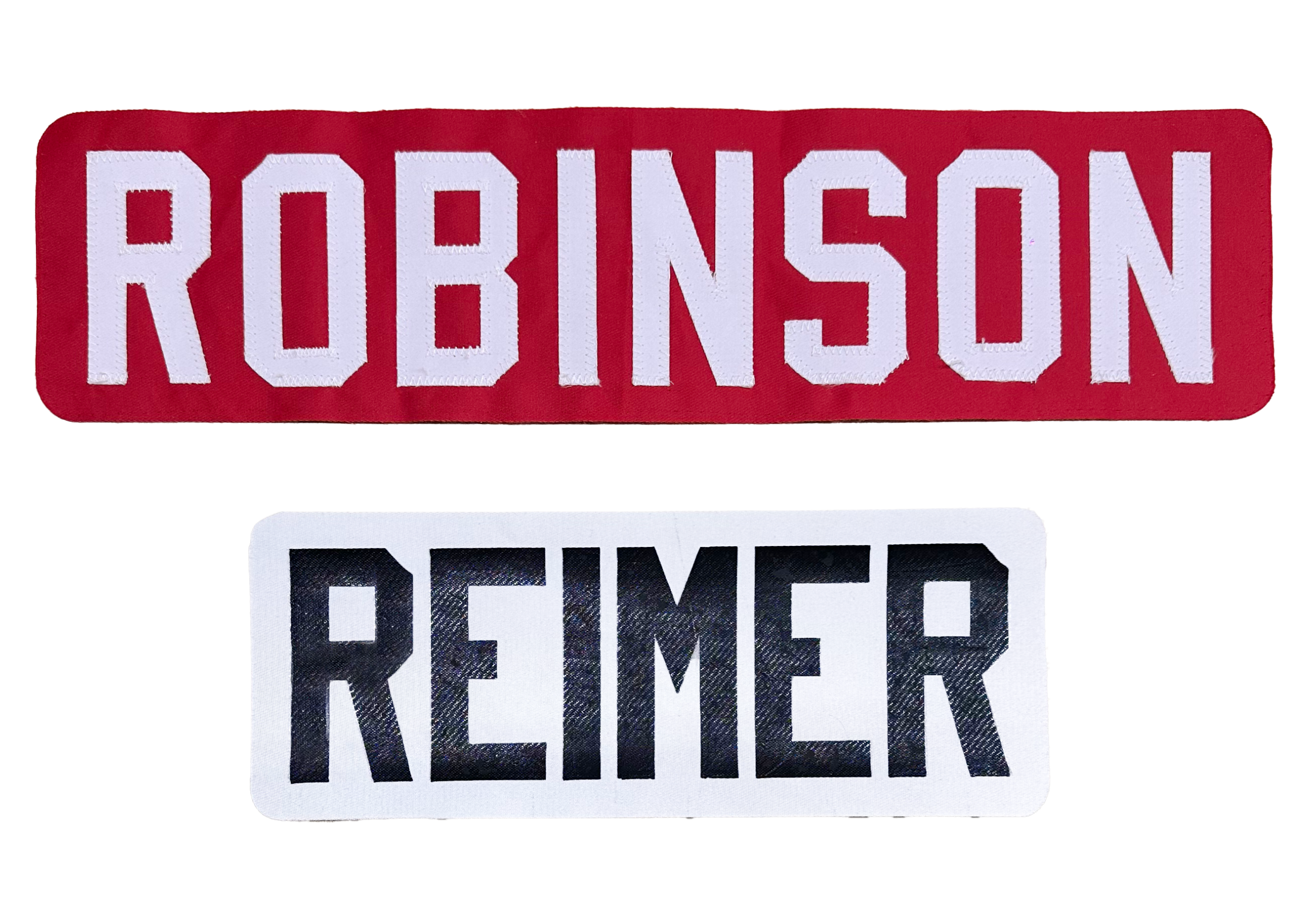 Protwill Letters – A 100% polyester fabric that is tightly woven, non-shrink, and durable, making it ideal for professional sports uniforms & athletic lettering. Heated and trasnfered to your name bars.